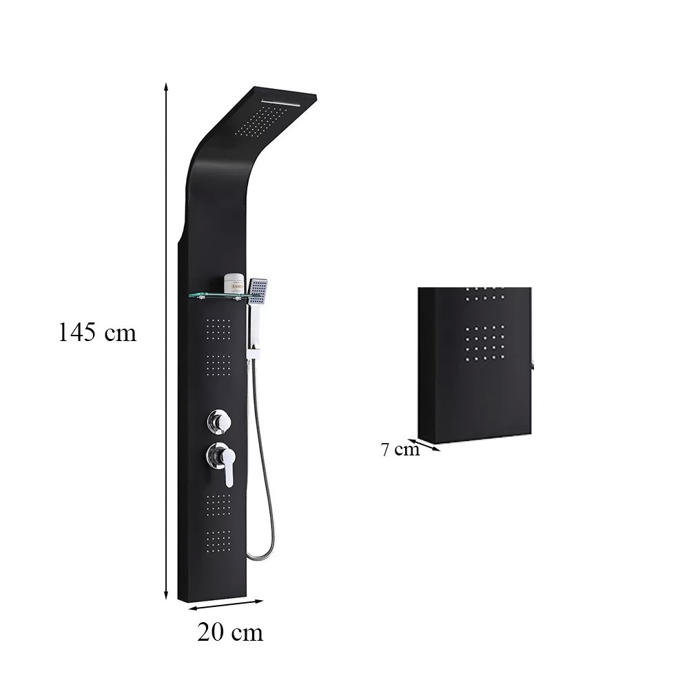 Méret: 150 x 19 cm, felületkezelt, fekete rozsdamentes acél test, kerámiabetétes csaptelep, 4 funkciós króm váltószelep, mechanikus keverő csapteleppel, integrált nagy méretű trópusi esőzuhany, 4 db integrált masszázsfúvóka, elegáns, krómozott kézi zuhanyfej, rozsdamentes gégecső (1,5m) - praktikus üveg tároló.