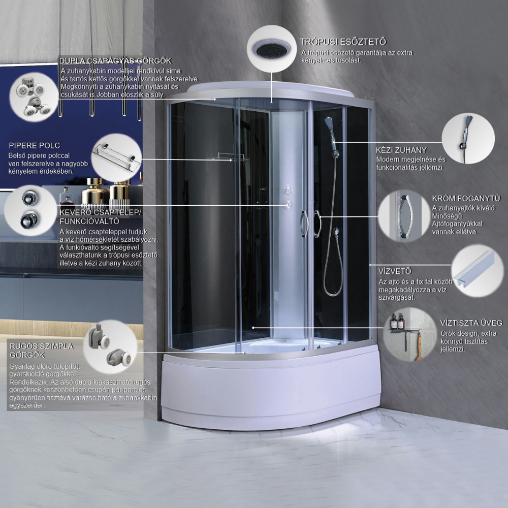 A Cora zuhanykabin számos hasznos funkcióval rendelkezik. Pipere polccal van felszerelve, melynek köszönhetően rendben tudod tartani a tisztálkodáshoz szükséges eszközeit. Trópusi esőztetővel és kézi zuhannyal is rendelkezik, melyet a funkcióváltóval lehet váltakoztatni. A víz hőmérsékletét a keverő csapteleppel lehet beállítani. A trópusi esőztető mellett helyezkedik el kettő szellőző, melyeknek köszönhetően távozik a felesleges meleg gőz ezzel megakadályozva a kabin párásodását.