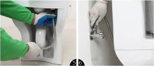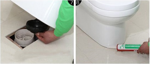 Alsó kifolyás esetén: csatlakoztasd a bekötő csövet, majd a bekötő csövet csatlakoztasd a szennyvíz elvezetőhöz és óvatosan helyezd rá a wc-t.Szilikon gél segítségével töltsd ki a hézagot a wc csésze és a csempe között. Ezzel a telepítés befejeződött. Szilikon gél használata után 24 órát hadjuk száradni!