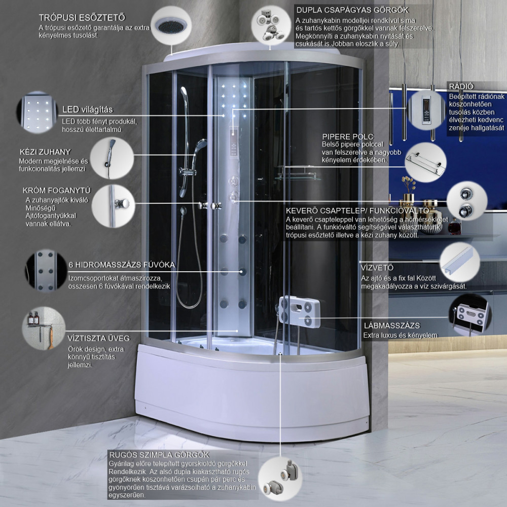 A Lia zuhanykabin számos hasznos funkcióval rendelkezik. Pipere polccal van felszerelve, melynek köszönhetően rendbe tudja tartani a tisztálkodáshoz szükséges eszközeit. Trópusi esőztetővel és kézi zuhannyal is rendelkezik, melyet a funkcióváltóval tud váltakoztatni. A víz hőmérsékletét a keverő csapteleppel tudja beállítani. A trópusi esőztető mellett helyezkedik el kettő szellőző, melyeknek köszönhetően távozik a felesleges meleg gőz ezzel megakadályozva a kabin párásodását. A kabinba 6 db hidromasszázs fúvóka van beszerelve, lábmasszírozó és rádió, melyek biztosítják az extra kényelmet. Ezeken kívűl LED és felső világítás is van a kabinban.
