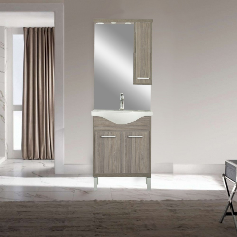 A fürdőszoba bútor kevés helyet foglal viszont tágas szekrénnyel rendelkezik ahol kényelmesen elférnek a fürdőszobai pipere eszközök. Kevés helyigénye miatt kisebb fürdőszobák berendezésére is alkalmas, például panel lakásokban. A termék magas minőségű bútorlapból készül és színben passzoló élzárókkal van ellátva. A fürdőszoba bútor mosdóval együtt kapható.
