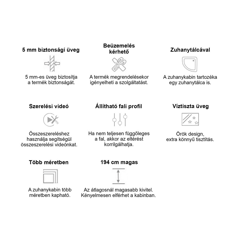 • Magasság: 180 cm (kabin), 194 cm zuhanytálcával együtt