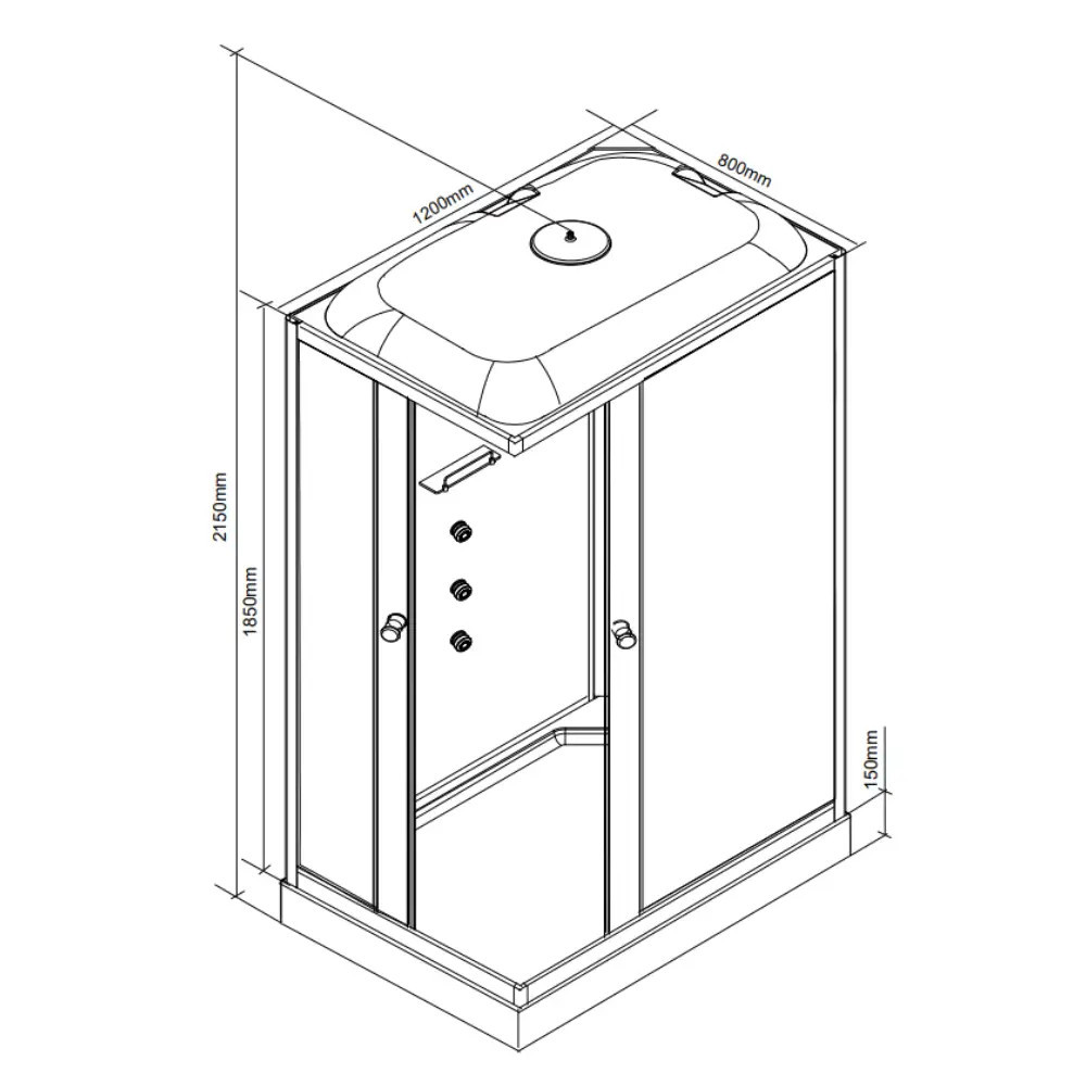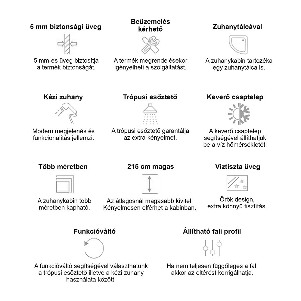 • Magasság: 185 cm (kabin), 215 cm zuhanytálcával együtt
