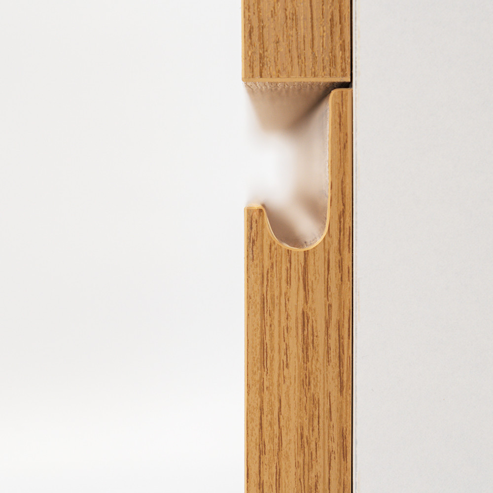 Az fehér korpusz és a tölgy front kombinációja elegáns és időtálló megjelenést kölcsönöz a bútornak.