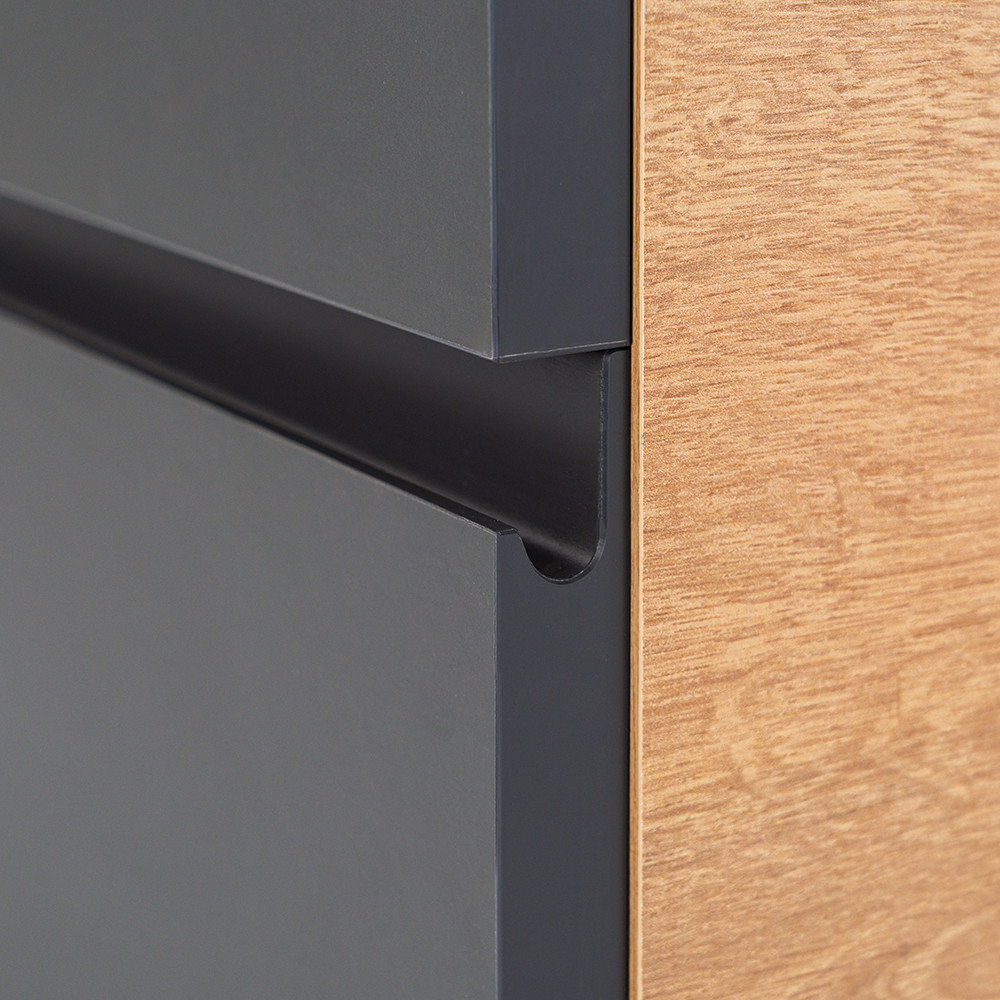 Az tölgy korpusz és a antracit front kombinációja elegáns és időtálló megjelenést kölcsönöz a bútornak.